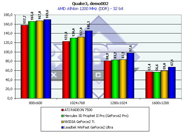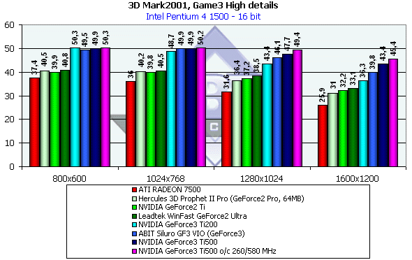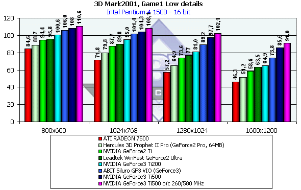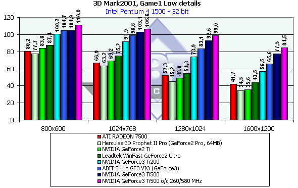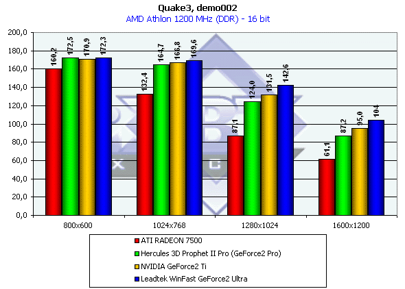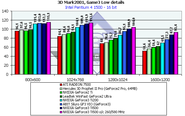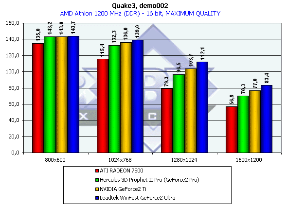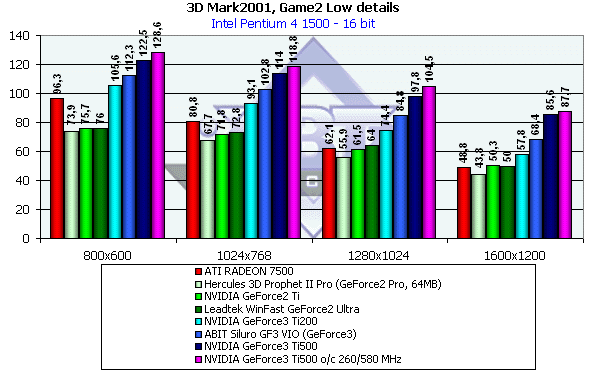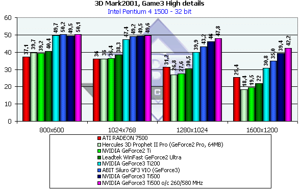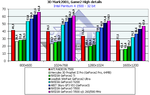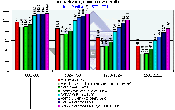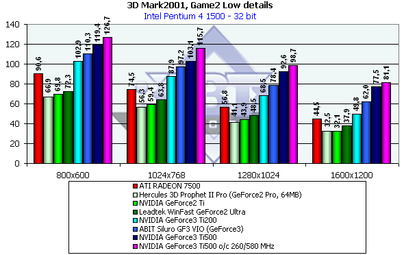 Мы видим, что Radeon 7500 в данном случае не только победил в своем классе, но и в 32-битном цвете уже вплотную подобрался к GeForce3 Ti200. Разумеется, тут сказывается то, что эта игровая сцена имеет очень высокий коэффициент перекрытий (overdraw), и традиционные ускорители, не имеющие оптимизации работы с Z-буфером, сильно просаживаются, так как "вырисовывают" кучу невидимых глазу поверхностей, то есть выполняют лишнюю работу. GeForce3 имеет возможность осуществлять подобные оптимизации, поэтому и производительность намного выше.
