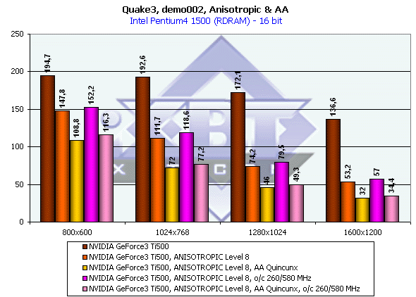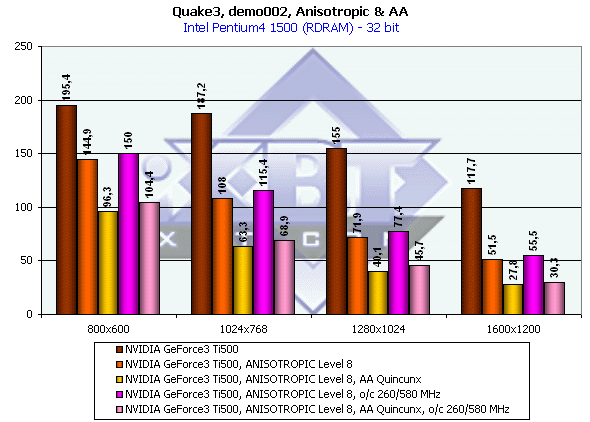 Хорошо видно, что падение производительности весьма велико, и даже разгон Ti500 (не говоря уж о его работе на штатных частотах) едва спасает играбельность в высоких разрешениях. Однако если учесть, что существует много игр, где не требуется сто и более FPS, то в разрешении 1024х768 в 32-битном цвете можно прекрасно играть при АА и анизотропии самой высокой пробы. Я не стану приводить скриншоты, поскольку качество анизотропии у GeForce3 можно увидеть в разделе 3DGiТогов, посвященном этой теме.