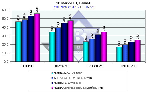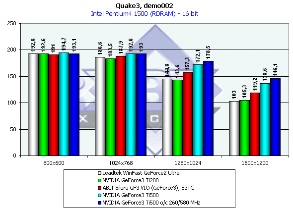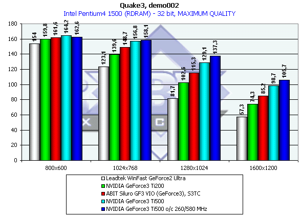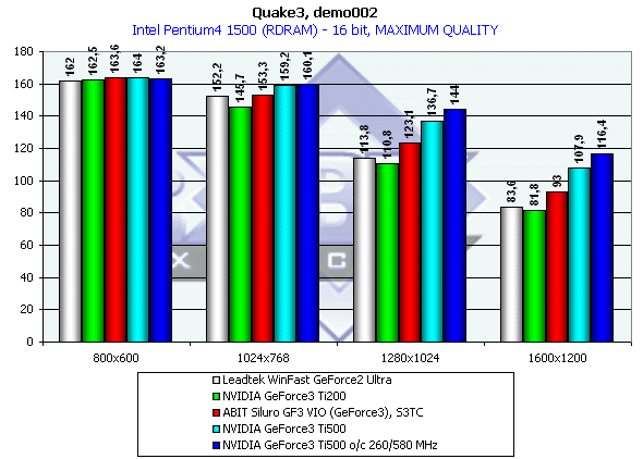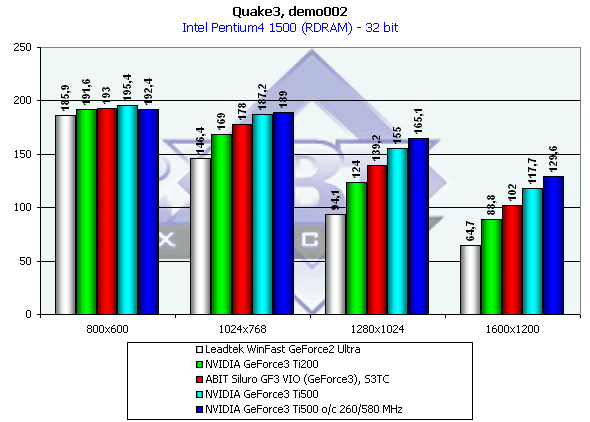 Повторю, что работа GeForce2 Ti эмулировалась при помощи видеокарты Leadtek WinFast GeForce2 Ultra путем установки частот работы 250/200 (400) МГц. Работа GeForce3 Ti200 эмулировалась при помощи NVIDIA GeForce3 Ti500 путем установки частот работы 175/200 (400) МГц.