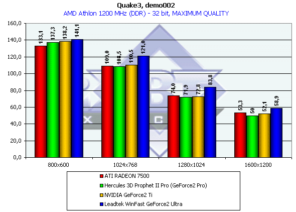 Хорошо видно, что Ti200 занял промежуточную позицию между GeForce2 Ultra и GeForce3 (в 16-битном цвете разницы между ним и GeForce2 Ultra практически нет). В 32-битном цвете все, как положено согласно частотным рамкам. Да и странно было бы ожидать чего-то иного от тех же GeForce3, работающих лишь на разных частотах.