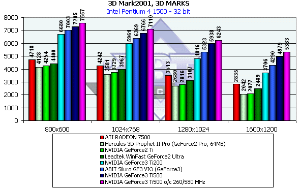 Общие результаты по 3DMark2001 нам демонстрируют промежуточное положение GeForce2 Ti между GeForce2 Pro и GeForce2 Ultra и явное превосходство над всеми ними новинки от ATI Radeon 7500.