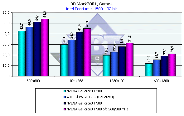 Учитывая, что этот тест состоит из нескольких подчиненных, и диаграмм получается весьма много, я не стал разделять GeForce2 Ti и GeForce3 Ti200/500 на разные диаграммы. Думаю, что по цвету столбиков читатели легко поймут, кого с кем надо сравнивать. Да и разница в производительности подчас может подсказать :-).