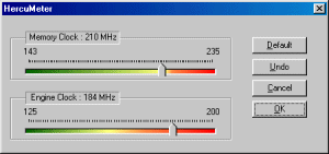 По умолчанию карта тактуется на 125/150 МГц как обычные nVidia Riva TNT2-карты. Максимальные значения частот устойчивой работы платы достигли 150/220 МГц. Естественно, что для получения таких частот потребовалось прикрепить на радиатор вентилятор.