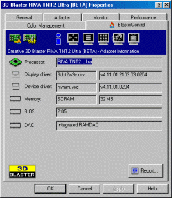 BIOS — версии 2.05.13, драйвера, поставляемые с картой, базируются на референс 1.20. Должен отметить, что фирма Creative постоянно работает над выпуском новых драйверов, поэтому на момент написания обзора уже вышли драйвера, основанные на референс 2.03. Драйвера выполнены в стиле Creative с одной закладкой Blaster Control, которая дает практически те же функции по настройке 3D, что и эталонные драйвера от nVidia,