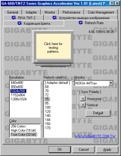 Драйвера представляют собой практически копию референс-драйверов от nVidia, примечательно только то, что они переведены на русский язык. С картой также поставляется утилита по настройке монитора и частот вертикальной развертки.