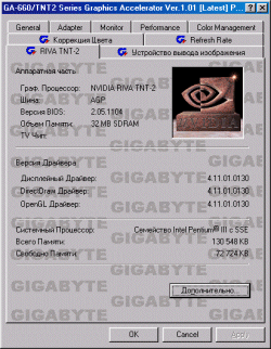 Видеокарта имеет AGP 4x конструктив, 32 Мбайт SDRAM 8 ns памяти, расположенной в 4-х 64-мегабитных модулях. Примечательно, что имеется много пустых мест под микросхемы, что говорит об использовании фирмой-производителем некоей унифицированной печатной платы. Чипсет закрыт радиатором, который я снял впоследствии, чтобы убедиться в том, что на карте действительно установлен nVidia Riva TNT2 M64, поскольку BIOS платы гласил, что у нас nVidia Vanta. Драйвера определили плату тоже как Vanta. BIOS версии 2.05.12, драйвера базируются на референс 1.22 и ничем не отличаются от ранее рассмотренных.