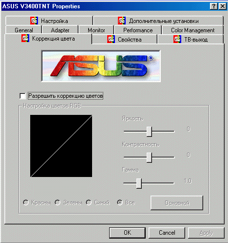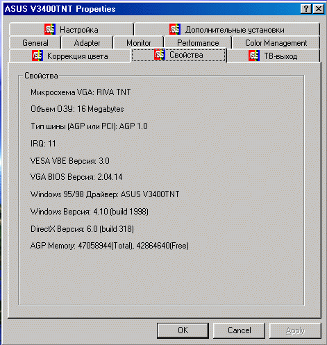 - ASUS V3400 TNT — Единственный конек этой платы — надежность. Однако, лучше приобрести вессию с TV, обладающую к тому же рекордным быстродействием.