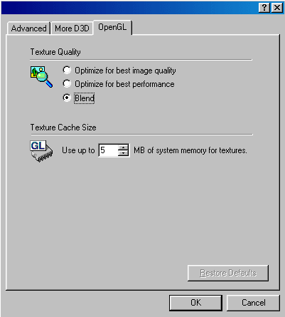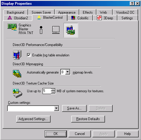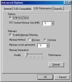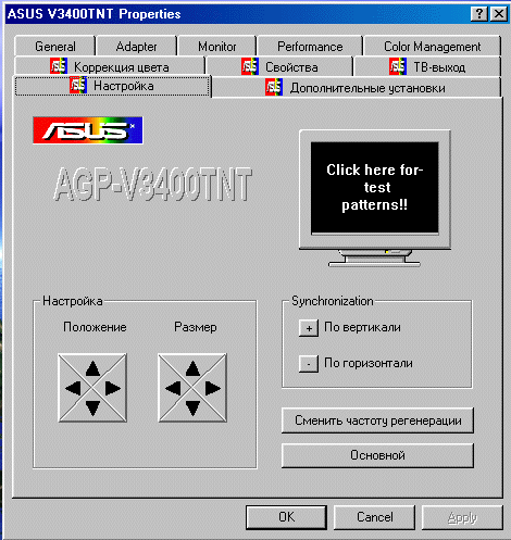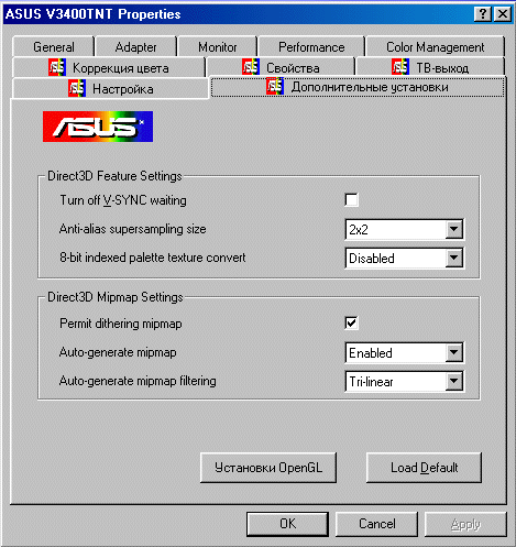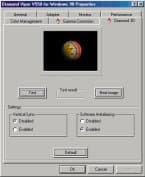 На представленных скриншотах видно, что информация о текщих версиях драйверов, а также о самой плате есть у всех, кроме Viper V550. Настройки Direct3D и OpenGL также есть везде, кроме Viper V550, у которой имеется только включение-выключение Vsync. У платы ASUS V3400TNT-TV (с ТВ) есть еще настройки по ТВ-выходу, на представленном скриншоте видно, что ТВ-выход работает при разрешении 640х480 и 800х600, причем есть выбор: выводить изображение одновременно на монитор и телевизор или отдельно на каждый из них. Параметры для разгона есть в драйверах у Spectra 2500 (по памяти, причем без четкой градации в МГц) и у GB RivaTNT (только по памяти). У V3400TNT и ViperV550 подобных настроек нет. Поэтому для разгона рекомендую пользоваться утилитой PowerStrip от Entech.