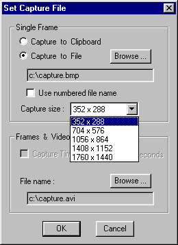 Сам захват отдельных кадров производится либо нажатием кнопки F5, либо нажатием соответствующей кнопки на панели управления Live3400. Возможен также захват ряда кадров (например, для составления слайд-шоу). Захват видео и запись в видеоролик производится в формате AVI и ничем особенным не выделяется, захвата звука не производится (что очень снижает роль видеокапчинга, т.к. приходится звук записывать отдельно, а потом при помощи программ типа Adobe Premier совмещать видеоизображение со звуком). Для примера сообщу, что Matrox Rainbow Runner Studio, которая также позволяет видеокапчинг, записывает и звук при наличии звуковой карты и соединения с ней (Line-in) источника звука.