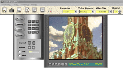 Первая версия этой программы вообще отказалась запускаться на моем компьютере, выплевывая сообщение "Error EAccessViolation". В результате переписки с производителем выяснилось, что программа не дружит с DirectX 8.0. После того, как мне прислали обновленную версию, эта ошибка исчезла. В новой версии программы ASUS Digital VCR появился полноценный список стран, из которого можно выбрать как "Russia SECAM", так и "Russia PAL" (ну сплошные крайности!). Правда, в последнем случае плата все равно работала в SECAM'е. Заработал звук в тюнере и теперь можно было комфортно смотреть телевизор в процессе написания этой статьи.