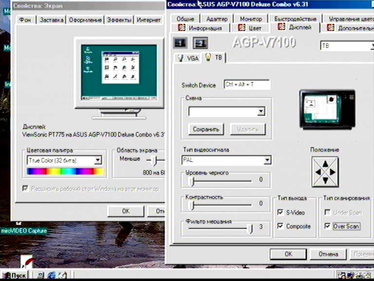 Второе назначение этих выходов — вывод результатов видеомотажа на ленту. И здесь вызывает недоумение следующий парадокс. Для того, чтобы вывести на TV-out оцифрованное изображение, нужно в настройках видеокарты включить режим "дублирование содержимого рабочего стола" (Clone) и воспроизвести нужный видеофайл с полным разрешением компьютерного монитора (например 800х600). Однако фирменная программа для полноэкранного воспроизведения видео ASUS Digital VCR в режиме Clone не работает (при загрузке она честно сообщает, что не может работать с включенной опцией Clone). Безусловно, я нашел стороннюю программу, способную воспроизвести нужные мне видеофайлы в полноэкранном режиме (Adobe Premiere 5.1), но данная ситуация мне кажется это неправильной.