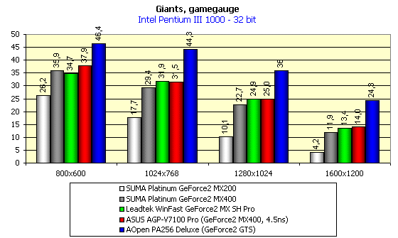 Как видим, сильная нагрузка этого теста почти свела на нет преимущества по частотам нашей карты, и все платы класса GeForce2 MX показали почти равные результаты (за исключением, конечно, урезанного по шине MX200). И отставание от GeForce2 GTS стало более существенным и явным. Впрочем, это уже свойство всего класса GeForce2 MX — карт, они не создавались для тяжелых игр в высоких разрешениях (для таких игроков есть GeForce2 Pro и выше).