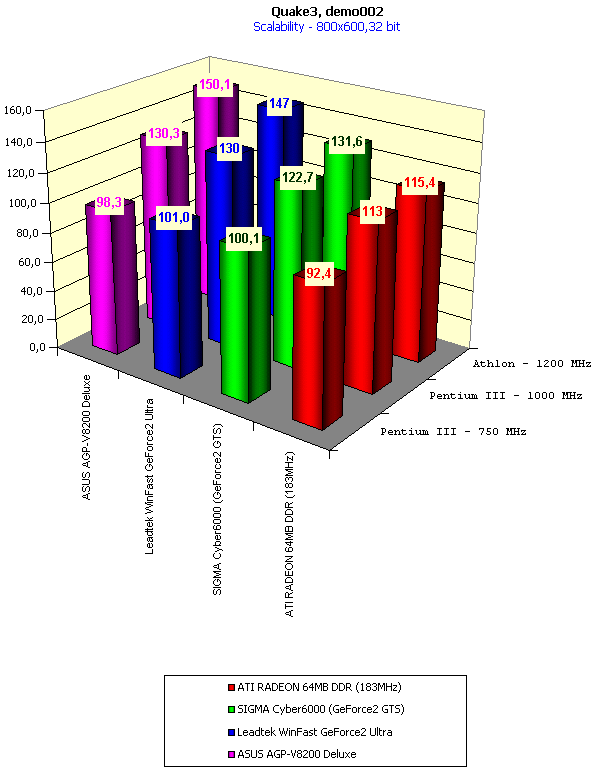 По итогам этого исследования мы очень хорошо видим, что приобретать видеокарту класса ASUS AGP-V8200 Deluxe имеет смысл только владельцам высокочастотных центральных процессоров (от 1 ГГц и выше). Даже такая относительно высокая частота в 750 МГц (а у многих российских пользователей даже такие частоты — еще в диковинку) сильно урезает потенциал видеокарты, делая ее выгодной только в очень высоких разрешениях.