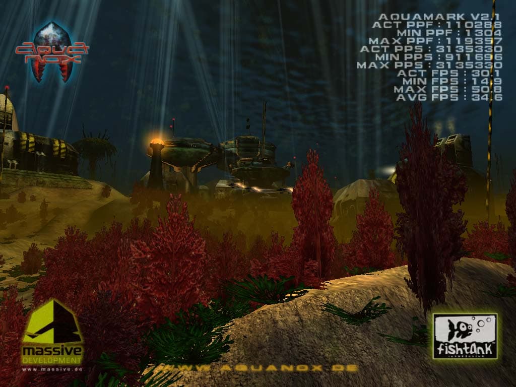 Конечно, можно ожидать, что при выпуске уже готовой игры разработчики в число настроек введут достаточно число опций, чтобы можно было облегчить ситуацию с такими нагрузками на акселераторы, а иначе просто никто играть не сможет в такие игры. К тому же, до выхода игры еще далеко, и потому следует ждать оптимизаций ее движка, что должно способствовать увеличению производительности видеокарт в AquaNox. Ниже представлены скриншоты из этого теста:
