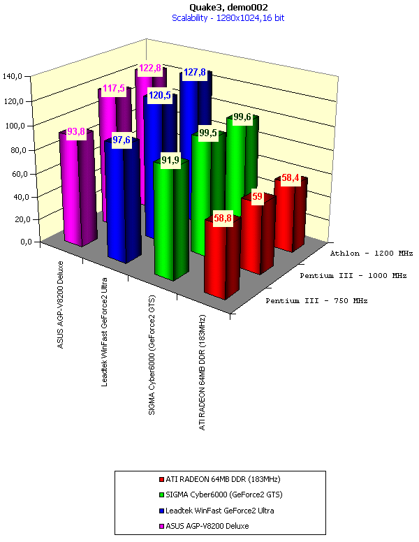 Этот тест нам просто показывает положение флагмана 3D-игровой графики в линейке чипсетов от NVIDIA. Хорошо видно, что в 16- битном цвете GeForce3 отстает от предшественника GeForce2 Ultra (мы уже говорили об этом в нашем первом обзоре), но зато в 32-битном цвете это безусловный король. Видеокарта ASUS AGP-V8200 Deluxe продемонстрировала производительность на уровне ранее рассмотренных карт на этом чипсете.