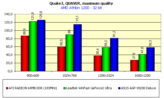 Тестирование проводилось в двух режимах: Fast (демонстрирует работу карты в 16-битном цвете) и High Quality (демонстрирует работу карты в 32-битном цвете). Использовались два разрешения: 1280х1024 и 1600х1200, поскольку в более низких разгон видеокарты почти не оказывает никакого влияния на производительность из-за влияния частоты центрального процессора.