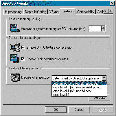 C помощью Riva Tuner можно корректно включать анизотропную фильтрацию не только в OpenGL (где настройки в драйверах позволяют это сделать), но и в Direct3D (а не копаться в Registry в поисках нужных ключей). Мы уже писали ранее о возможности включения у GeForce3 трех степеней анизотропии: при выборке 8-ми, 16-ти и 32-х текстурных сэмплов. Последняя степень — самая красивая по эффекту, но одновременно и очень прожорливая в плане падения производительности. Об этом можно почитать в нашем обзоре по GeForce3.