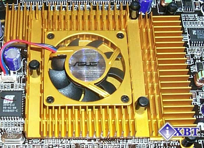Прежде всего бросается в глаза массивная система охлаждения золотистого цвета. На этой карте ASUSTeK применил совершенно новую и необычную конструкцию, состоящую из центрального радиатора с вентилятором и примыкающих к нему боковых реберных радиаторов.