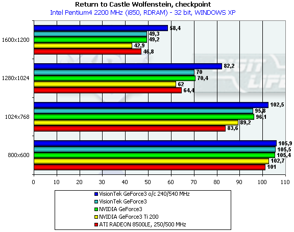 - Return to Castle Wolfenstein (MultiPlayer) (id Software/Activision) — OpenGL, мультитекстурирование, Checkpoint-demo, настройки тестирования — все на максимально возможном уровне, S3TC OFF, конфигурации можно скачать тут