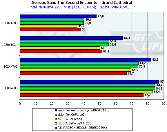 Обладая ценой самых дешевых ATI RADEON 8500LE, карта от VisionTek, как и следовало ожидать, опередила соперника во всех разрешениях.