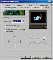 И перед подведением итогов хочу сказать пару слов о дополнительной функции, имеющейся у Voodoo3 3000, о TV-out или ТВ-выходе. При настройке драйверов для вывода изображения на телевизор следует пользоваться закладкой в настройках дисплея.