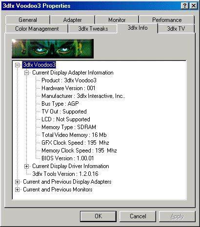 Как и в прошлый раз, при установке Voodoo3 2000, драйвера и на трехтысячную плату установились без осложнений (версия осталась прежней от 20 марта 1999 года).
