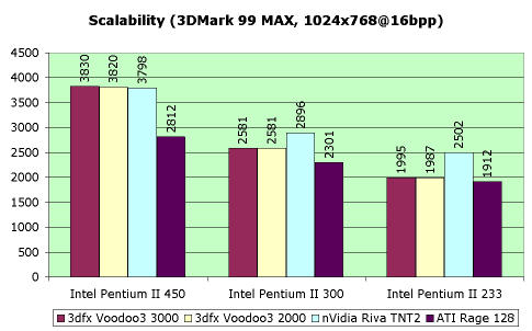 Результаты по тесту 3DMark 99 MAX при тестировании с процессором Intel Penium III получились следующими: