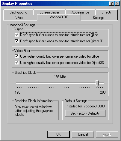 Для установки более высоких частот работы видеокарты (разгона) мы использовали свежую версию 1.40 программы Voodoo3 Overclock Property Page (автор Gary Peterson), которая управляется закладкой в драйверах.