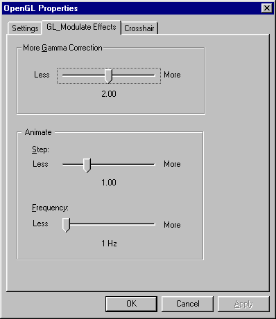 - теперь, рассмотрим установки OpenGL. Первая закладка - это регулировка режима работы приложений в том или ином разрешении и установка гаммы цветов для OpenGL приложений (что важно, учитывая затемняющий эффект очков):