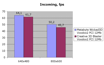 Для сравнительного тестирования была взята плата Creative 3D Blaster Voodoo², которая по внешнему виду оказалась очень похожа на Wicked3D. Причем, драйвера от Метабайт установливались прекрасно и на плату от Creative, а драйвера от Creative - на плату от Metabyte. Тем не менее, для чистоты эксперимента я протестировал каждую плату со своими драйверами, и вот что получилось: