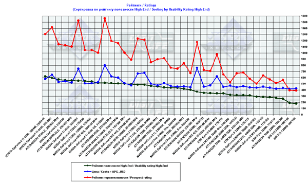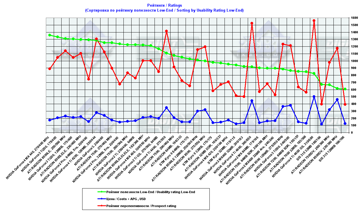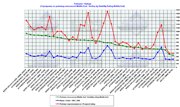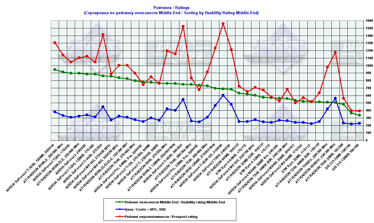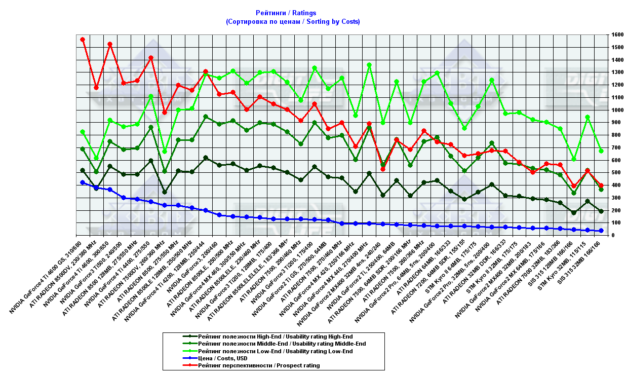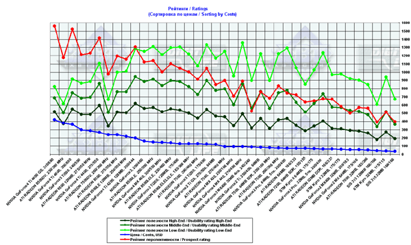 - сводные диаграммы по видеокартам стоимостью свыше $80 на базе стендов на Pentium 4 2100 MHz и Athlon XP 2000+.