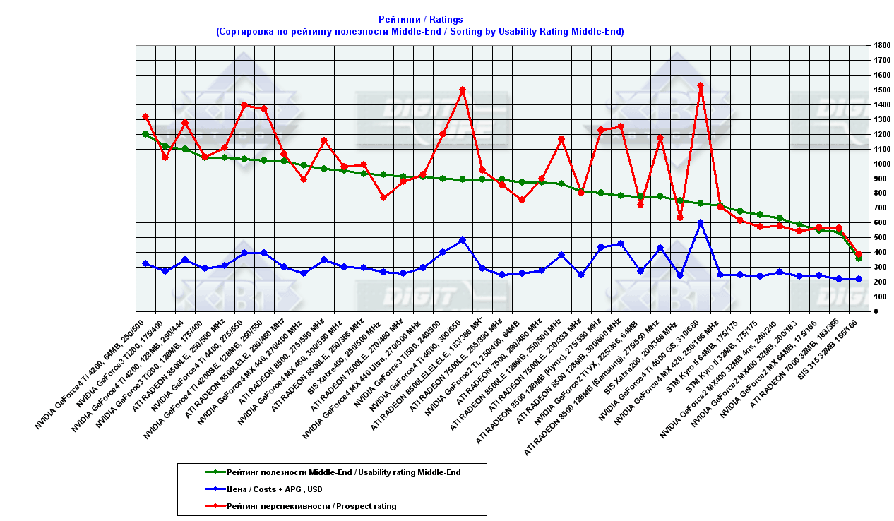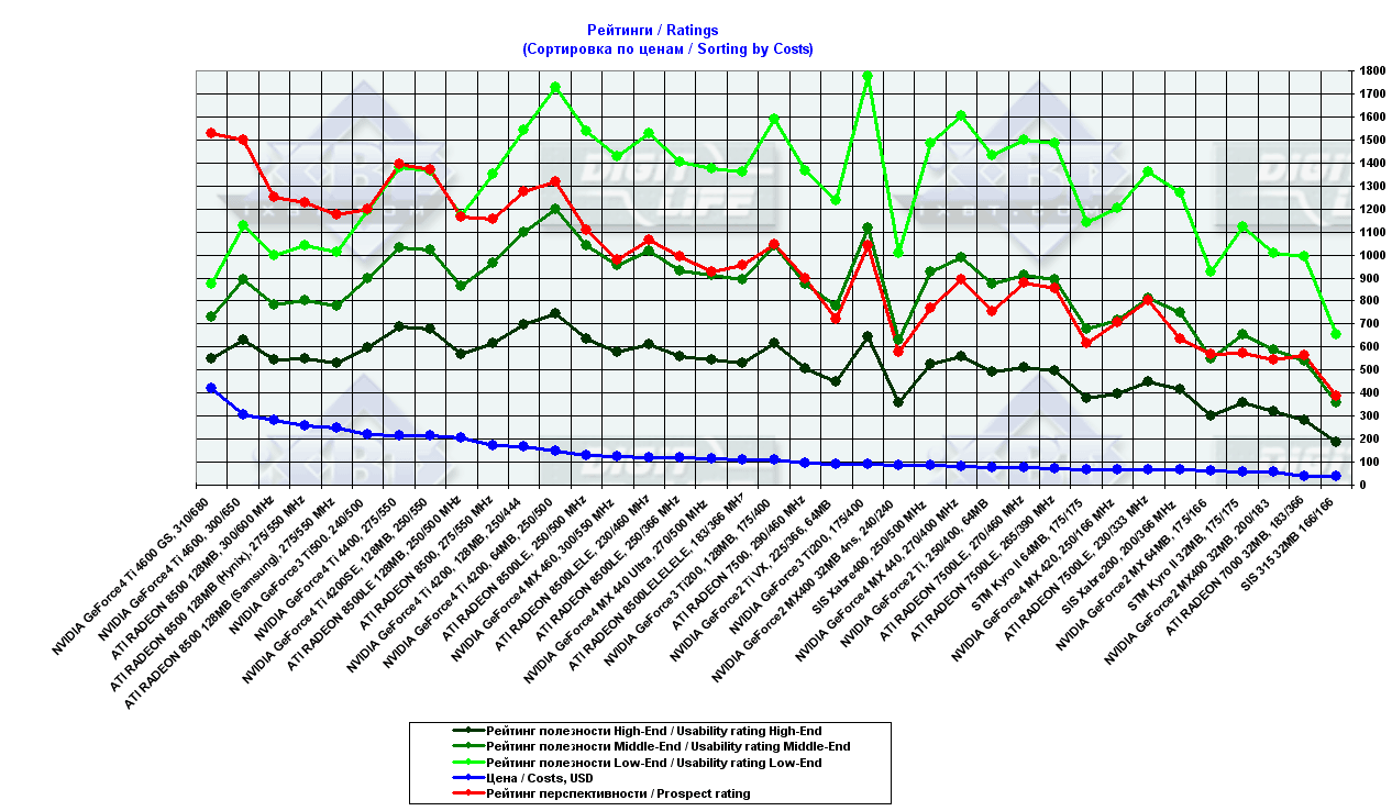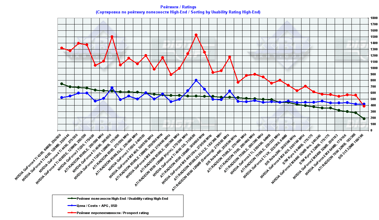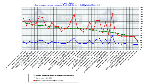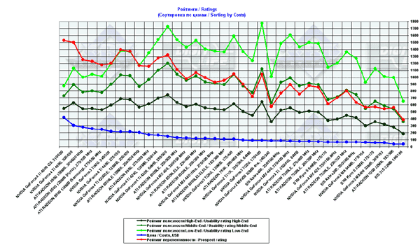- сводные диаграммы по видеокартам стоимостью свыше $80 на базе стендов на Pentium 4 2100 MHz и Athlon XP 2000+.