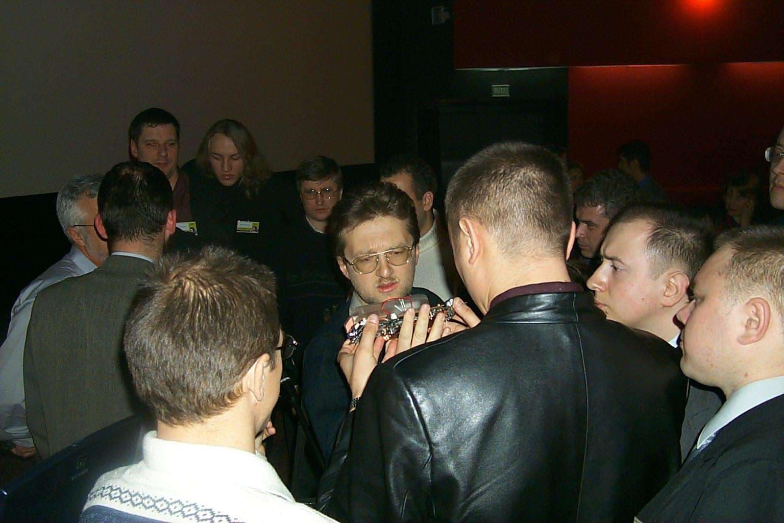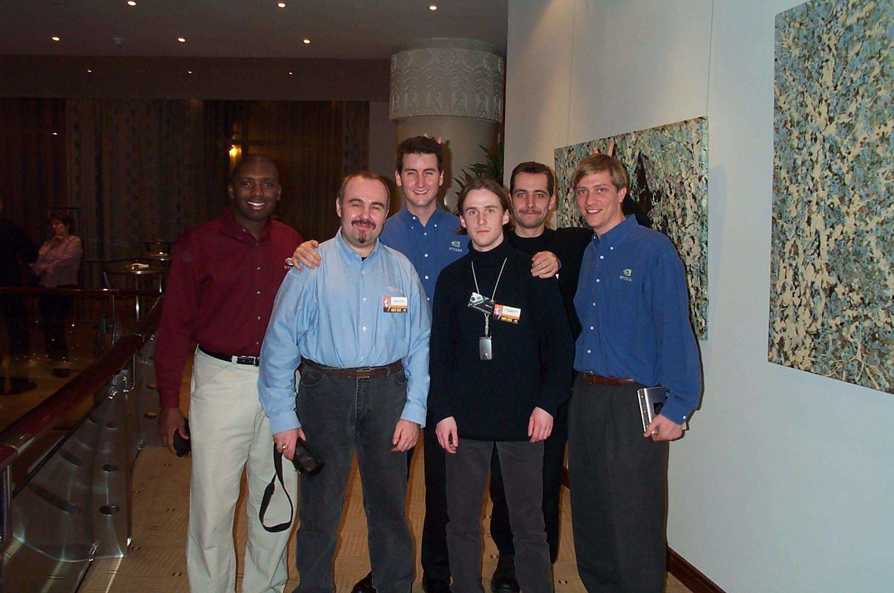 Уже более обстоятельно мы пообщались с NVIDIA на фервальском форуме, посвященном архитектуре NV3x и выпуску Quadro FX (Саша Кондаков спрятался за всеми и второй справа во втором ряду, Андрей Воробьев слева в первом ряду, рядом с ним справа автор RightMark 3D игрового теста и почти всех синтетических тестов Филипп Герасимов):