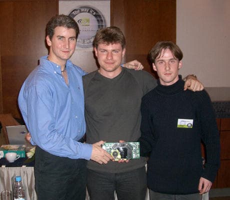 Но перед этим всем в Москве состоялось крупное мероприятие NVISION-October'2003, организованное NVIDIA, где собрались представители большого числа компаний-разработчиков игр, а также издателей компьютерных игр. Семинар организован в рамках программы NVIDIA «The way it's meant to be played». Целью мероприятия являлось налаживание более тесных связей между паблишерами и разработчниками (прежде всего российскими), ознакомление с новыми наработками NVIDIA, налаживание сотрудничества в рамках вышеуказанной программы. На данном форуме были и наши представители, они же авторы теста RightMark, выигравшие первый приз за лучшую быструю разработку уникального шейдера (слева Джон Спитцер, вручающий GeForce FX 5900 Ultra в качестве приза, посредине — Александр Медведев, справа — Филипп Герасимов: