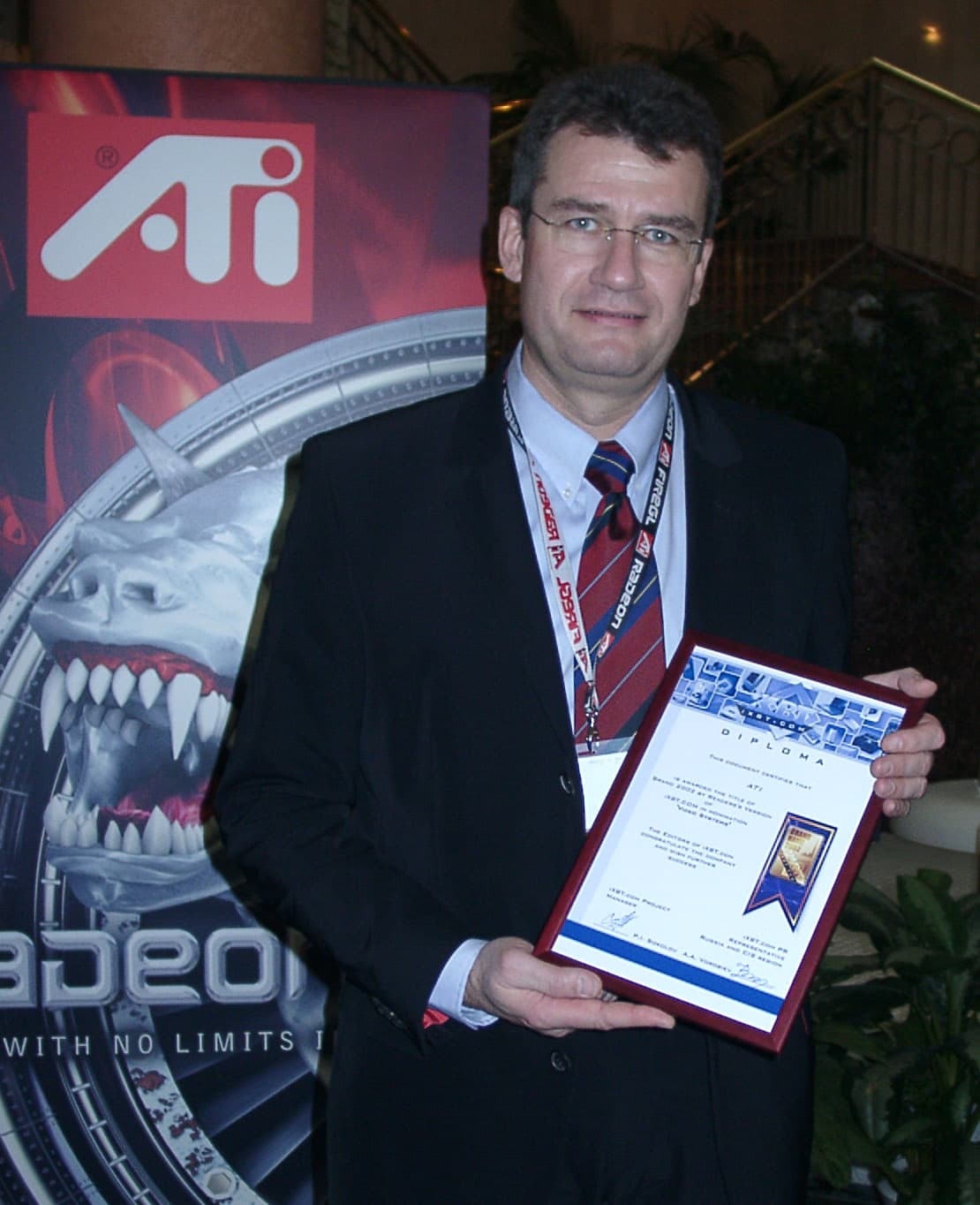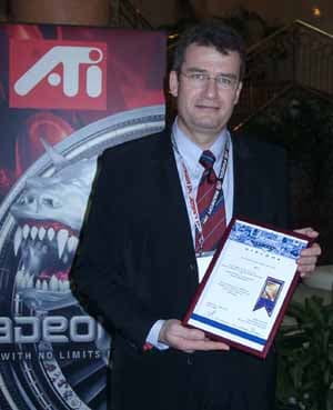 А вот интересным событием, знаменующим намерения ATI более активно заняться российским рынком, стал эвент, посвященный знакомству канадской фирмы, представленной внушительной делегацией, с реалиями российских компьютерных дел. Он случился в январе, и мы уже о нем писали в свое время, там же вице-президенту ATI Петеру Эдингеру был вручен диплом «Бренд 2002 года по выбору читательской аудитории»: