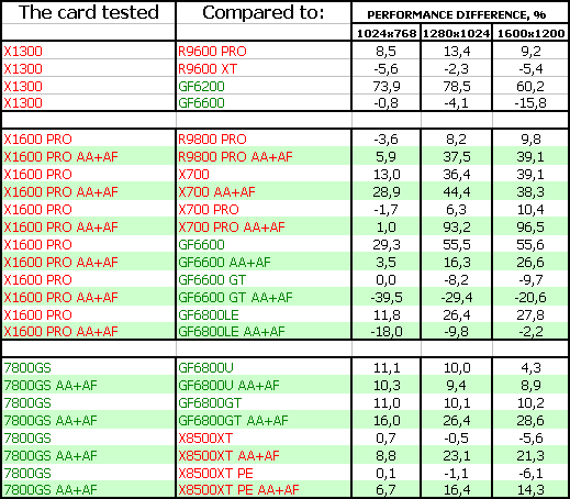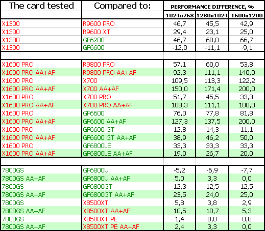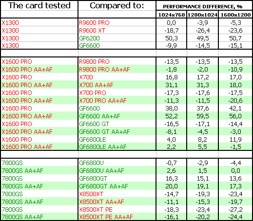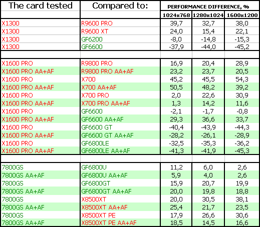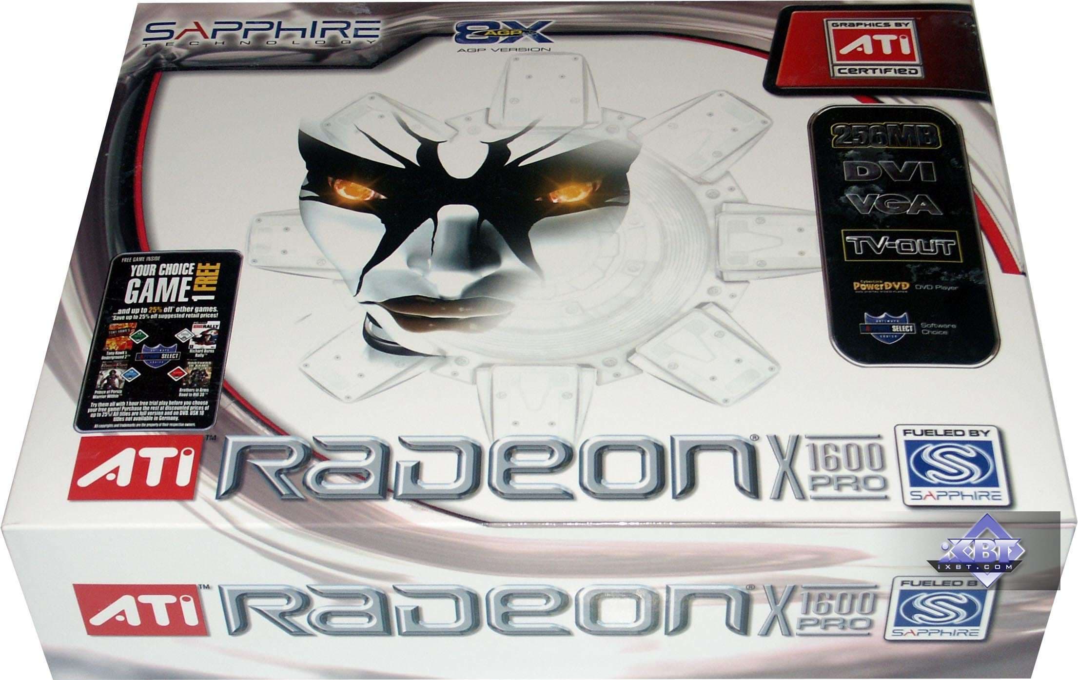 - Sapphire RADEON X1600 PRO 256MB AGP — продукт более долгожданный, чем остальные от ATI, поскольку дает еще оставшимся на AGP пользователям ускоритель среднего уровня в ценовом диапазоне 130 долларов, полноценно поддерживающий шейдеры 3.0, а также успешно конкурирующий с GeForce 6600/6600 GT (кроме ряда тестов). И даже GeForce 6800LE обойден в некоторых испытаниях.