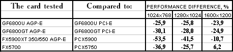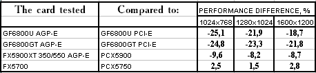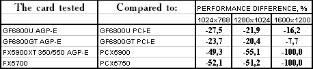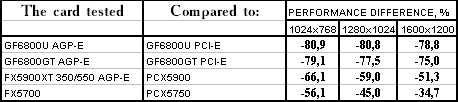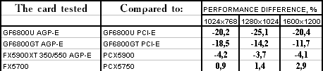 - NVIDIA GeForce 6800Ultra (Leadtek WinFast A400 Ultra, частота снижена до 400/550 (1100) MHz, 256MB) — против NVIDIA GeForce 6800 Ultra PCI-E (Reference card, частота 400/550 (1100) MHz, 256MB);