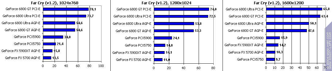 - FarCry 1.2 (Crytek/UbiSoft), DirectX 9.0, мультитекстурирование, demo01 (research) (запуск игры с опцией -DEVMODE), настройки тестирования все Very High.
