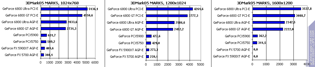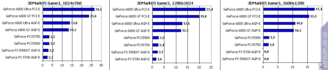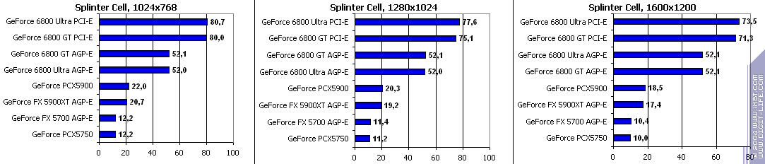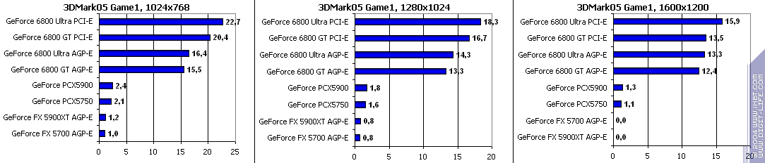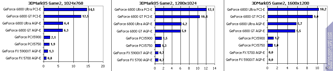 - NVIDIA GeForce 6800GT (Galaxy Glacier GeForce 6800GT, частота снижена до 350/500 (1000) MHz, 256MB) — против NVIDIA GeForce 6800GT PCI-E (Reference card, частота 350/500 (1000) MHz, 256MB);