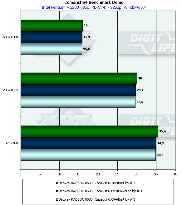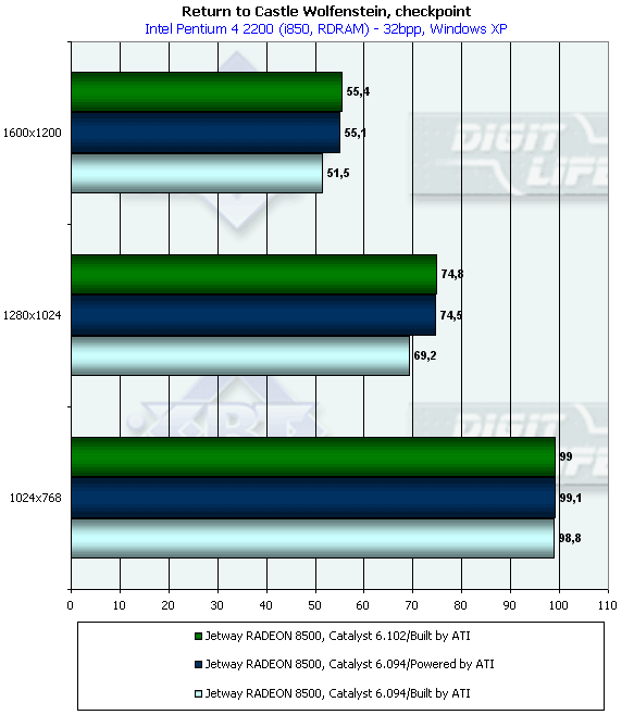 Интересно отметить, что версия драйверов 6.094/Powered by ATI обеспечила карте от Jetway неплохой прирост производительности, что даже странно. Любопытно, что последующая версия 6.102 только подтвердила данный прирост, хотя эта бета-версия рассчитана на карты Built by ATI.