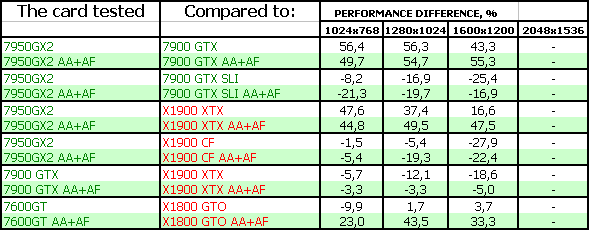 Да, подчас бывает, что X1900 XTX догоняет и даже обходит новинку от NVIDIA, однако это наблюдается в случаях, когда производительность упирается уже в системные ресурсы. А там результат непредсказуем. Тандем X1900 XT CF оказался более скоростным, но и цена у двух X1900 XT (CFE) намного выше.
