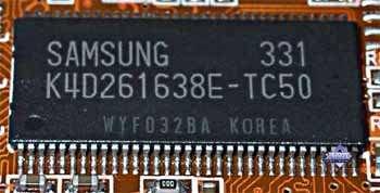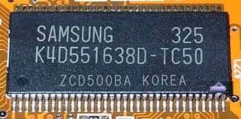 | Микросхемы памяти производства Samsung. Время выборки у микросхем памяти 5ns, что соответствует частоте работы 200 (400) МГц, память же работает на частоте 166 (333) МГц. Частота работы GPU 200 MHz. Шина обмена с памятью — 64 bit. | ![]() |