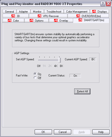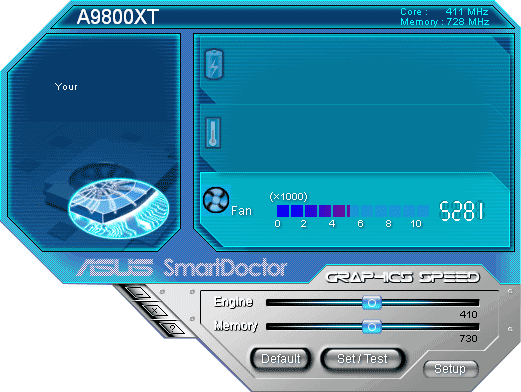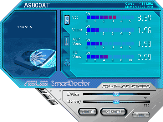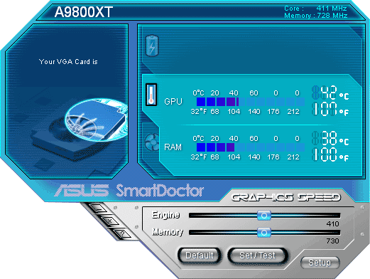 Теперь вернемся к RADEON 9800 XT. Как я выше уже сказал, эта карта поддерживает аппаратный мониторинг состояния, который реализован через фирменную утилиту ASUS SmartDoctor: