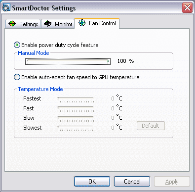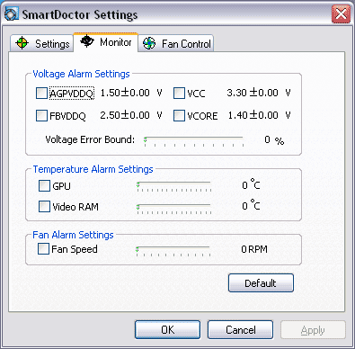 Эта программа позволяет не только следить за температурами и частотой вращения кулера, но и разгонять видеокарту. Обратим внимание на то, что SmartDoctor позволяет защищать карту от перегрева, регулируя частоты. И еще один нюанс: по умолчанию SmartDoctor выставляет на плате чуть более низкую частоту по ядру — 405, а не 412 МГц. Вернуть 412 МГц можно нажатием кнопки Default.