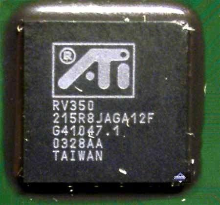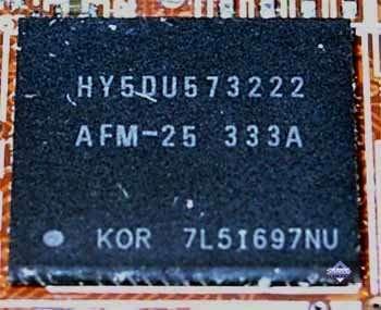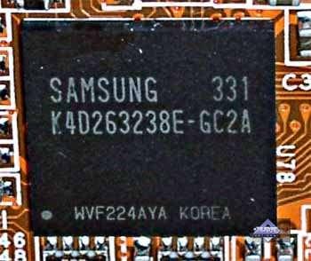 | Микросхемы памяти производства Samsung (BGA). Время выборки у микросхем памяти 2,8 ns, что соответствует частоте работы 350 (700) МГц, память же работает на частоте 300 (600) МГц. Частота работы GPU — 500 MHz. Шина обмена с памятью — 128 bit. | ![]() |