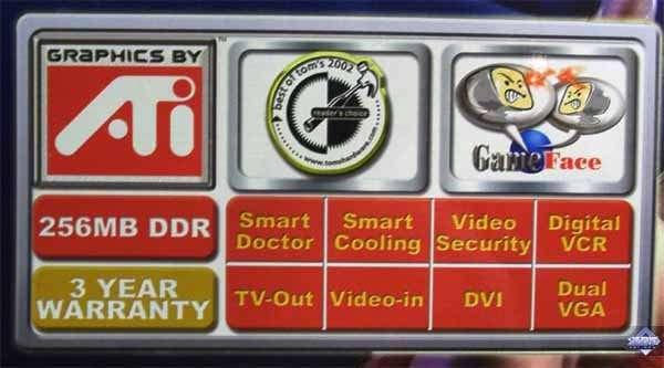 Если продолжать рассматривать карты, то заметим, что два продукта (9600 XT и 9800 XT) поддерживают VIVO, благодаря вышеупомянутому Rage Theater. Вообще, на коробках этих двух карт очень крупно приведены основные функции по работе с видео (пример с бокса от 9800 XT):