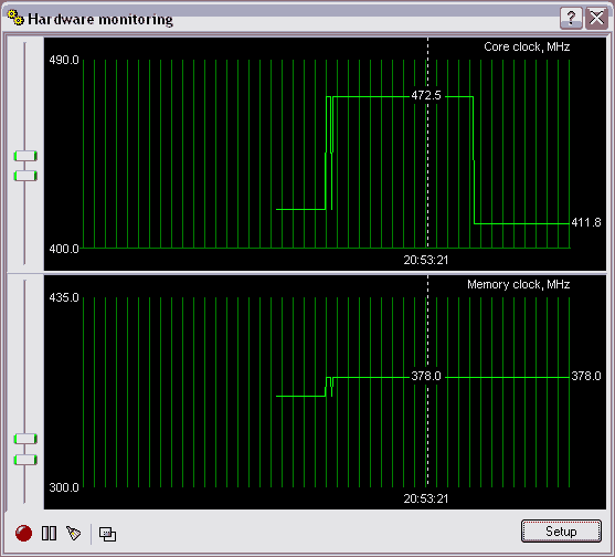 Перед рассмотрением этой функции замечу, что панель эта появляется только на референсной карте, при установке тех же драйверов на плату же от ASUS — этой закладки нет. Однако, что самое интересное, что функция все равно работает, то есть по умолчанию включается. Как это выглядит? Воспользуемся возможностью графического мониторинга у RivaTuner (автор А.Николайчук AKA Unwinder):