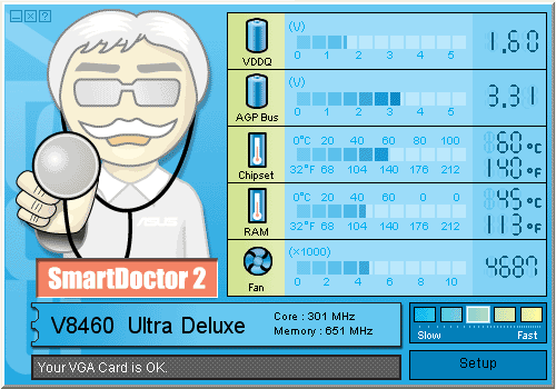 Что касается аппаратного мониторинга, то его обслуживанием занимается все тот же SmartDoctor, который в последнее время приобрел новые формы, да и новые возможности (в частности, динамические поднятия и повышения частот работы карты можно отменить и контролировать только температурный режим).
