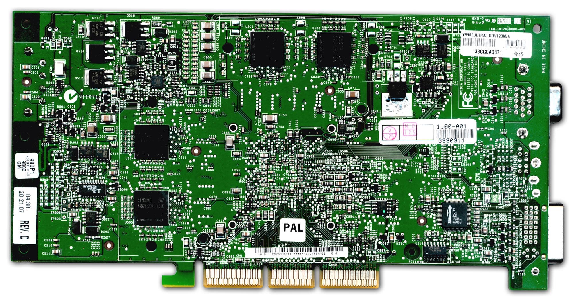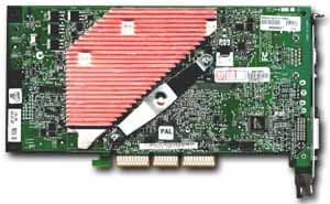 | Карта основана на интерфейсе AGP X2/4/8 , имеет 128 мегабайт памяти DDR SDRAM, размещенной в 8-ми микросхемах по обеим сторонам PCB. Интерфейс обмена с памятью 128бит. На карте установлены микросхемы памяти Samsung марки K4N26323AE-GC1K, форм-фактора BGA. Максимальная частота работы — 550 (1100) МГц, поэтому можно сделать вывод, что время выборки 1.8 нс. По умолчанию память работает в 3D на частоте 500 (1000) МГц, в 2D — 300 (600) МГц. | ![]() |