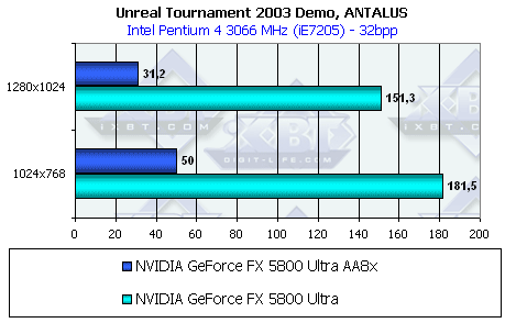 Обратите внимание на то, что даже установка чуть более легкого режима АА 4xS (а не 6xS) не спасла GeForce FX от поражения. Да, режим Application при анизотропной фильтрации по-прежнему пожирает колоссальные ресурсы GPU. Именно это и стало причиной такого сильного проигрыша. Вопрос: а нужен ли этот режим? Вполне и Balanced подходит (наши предыдущие исследования это доказали).